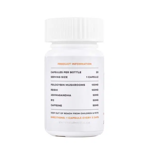 • Dosage and Composition: Each capsule contains 100mg of psilocybin, complemented by reishi mushrooms, ashwagandha, vitamin B12, and caffeine for added energy and stress relief. A full bottle includes 20 capsules (totaling 2000mg).